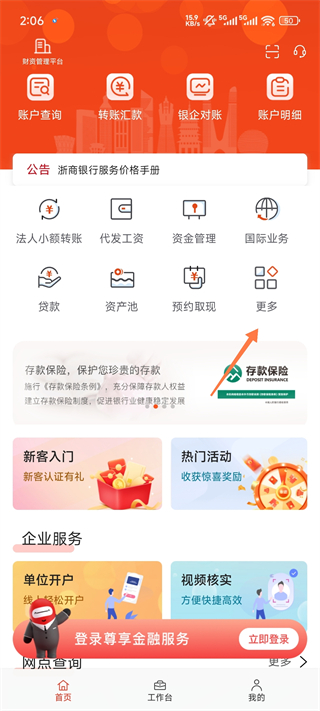 1、打开浙商银行企业手机银行App首页,可查看常用功能入口及业务分类;点击【更多】可浏览全部菜单。