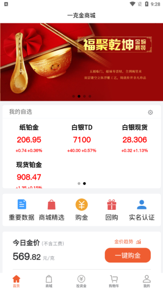 一克金App是一个由苏投黄金开发的电子商城软件,主要提供各种黄金产品,比如投资金条、首饰和摆件等。所有商品都经过专业检测,品质有保证,不用担心买到假货或瑕疵品。除了卖黄金,App还实时更新国内外金价波动数据,方便用户查看并进行线上回购。