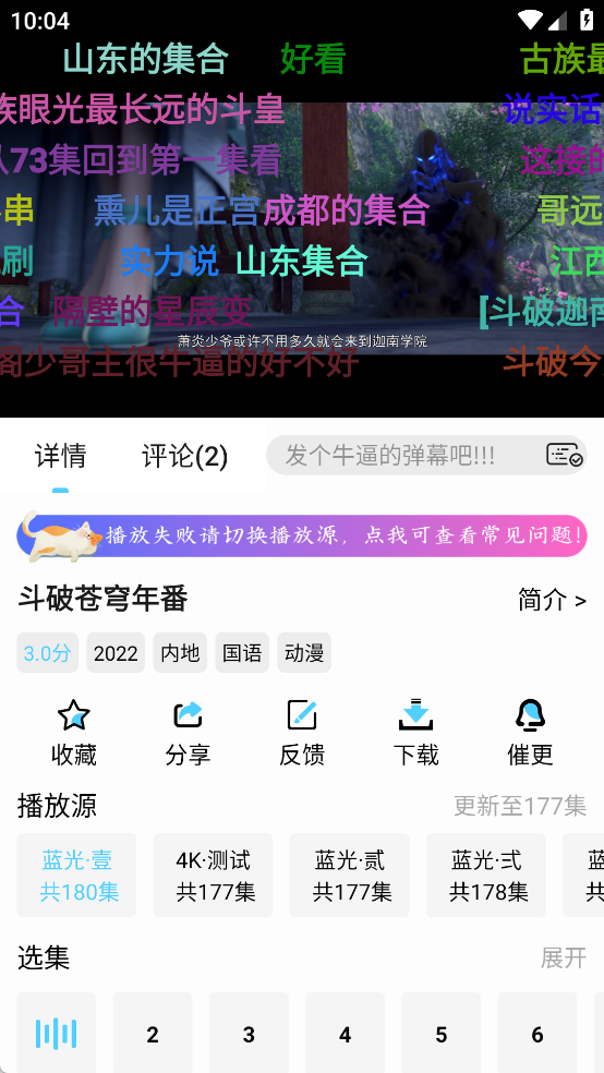 3、在播放页面,您可以切换播放源、选择剧集,还能发送弹幕、收藏或分享作品。