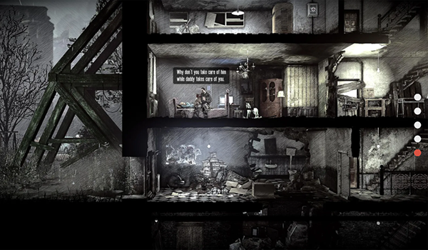 白天大部分地区都处于交战状态,游戏设定白天外出街道上有狙击手(哪管好的坏的=_=,看见会动的就打)所以玩家操纵的角色在白天只能呆在家里活动,这段时间玩家可以操纵角色修复避难所的破洞增强防御,也可以搭建更多的设施,疲劳的角色也可以在这段时间休息。其他幸存者也有几率拜访交易或者寻求帮助,玩家可以与他们交易或者帮助他们(帮助他们有几率让出去帮助的那个角色受伤)。