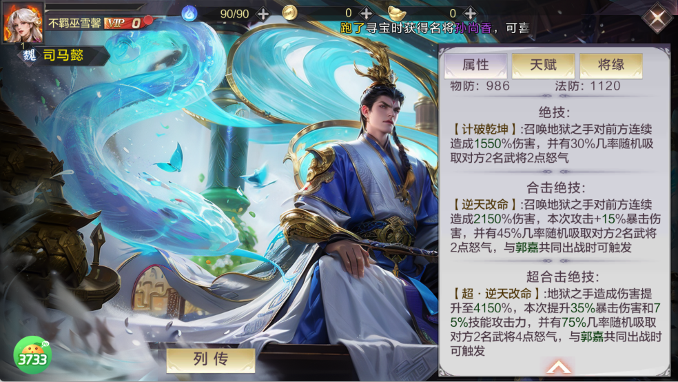 超合击绝技【超・逆天改命】:4150% 伤害 + 75% 暴击,吸怒 + 禁疗,搭配郭嘉触发,是团队控场兼输出点。