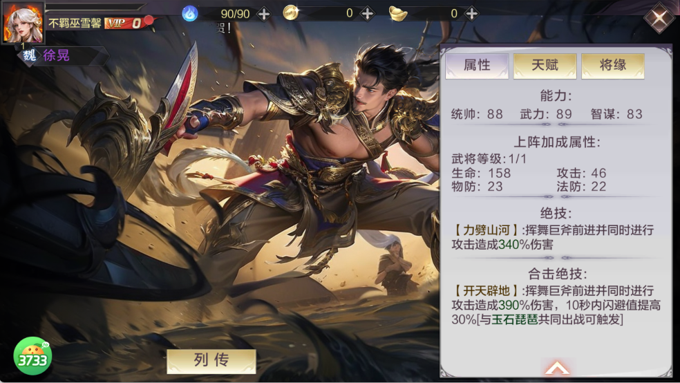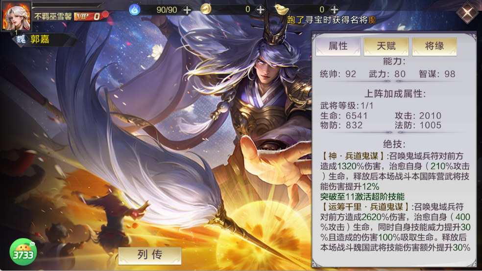 核心属性:武力 110(顶尖输出属性)、统帅 96、智谋 99,属性偏向输出;