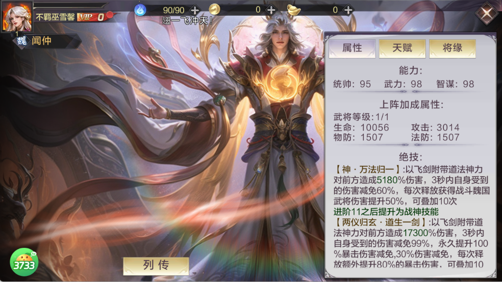 超阶技能【两仪归玄・道生一剑】:9300% 伤害 + 3 秒 99% 减伤,永久叠加魏国武将伤害,是团队主 C 兼坦度担当。