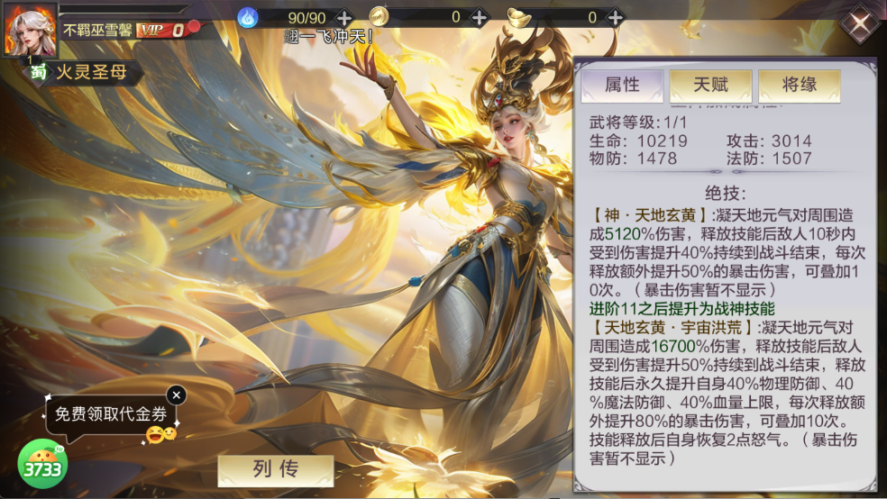 核心属性:生命 10219、攻击 3014,双防较高(物防 1478、法防 1507);