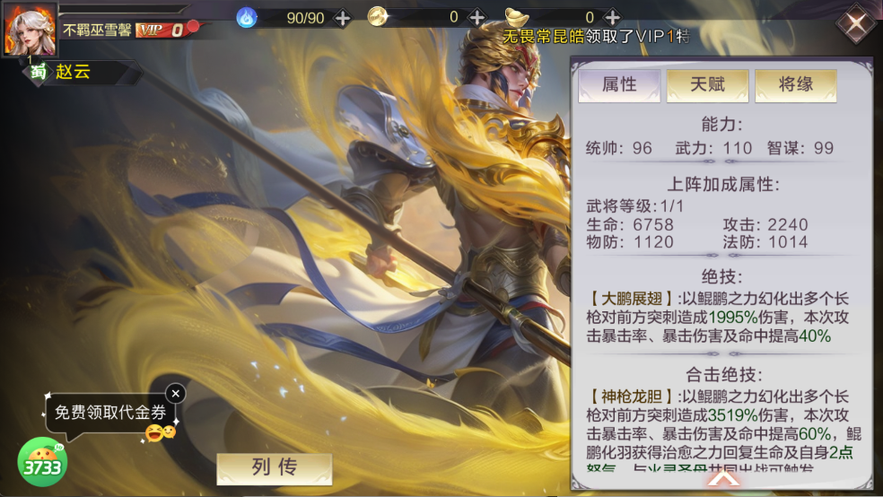 合击绝技【神枪龙胆】:3519% 伤害 + 60% 暴击 / 暴伤 / 命中提升 + 生命 / 回怒,是蜀国阵营的核心输出,搭配合击触发角色可最大化爆发。