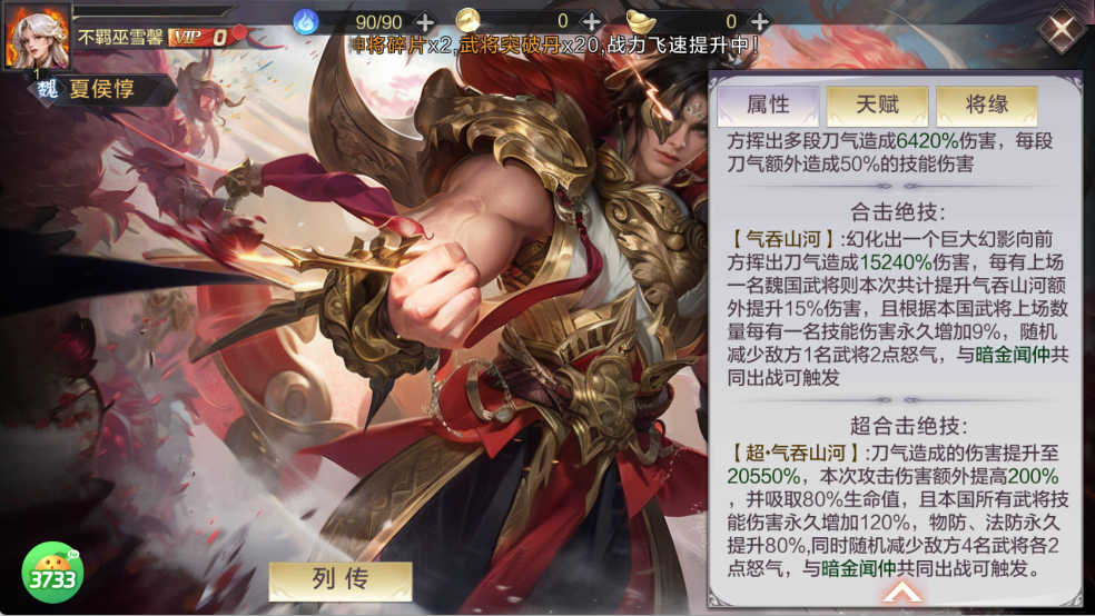 合击绝技【气吞山河】:15240% 伤害,随魏国武将数量增伤,附带减怒;