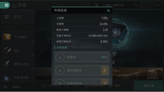 在介绍完游戏中的两种交易方式后,现在就要重点说一下税率的问题了。上面也说过,市场交易非常便捷,只要价格合适,便宜的货物基本就是一键出售,昂贵的货物也不会停留太久。因为放在市场上的货物,那是在全宇宙任何地方的玩家都能看到的,只要有需求,你就能赚到钱。因此,市场的基础交易税高达15%,还有8%的上架费(中介费),哪怕把会计学技能点到满级,也只是少了3%的上架费和5%的交易税。(下图是只点满了基础会计学技能,所以只是各减了1%)