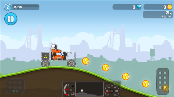 3、改造好赛车后就可以出发了,左边是刹车,右边是油门,如果车头翘起就刹车,车尾翘起就加速,我们要做的就是操作赛车在能量耗尽之前抵达终点,就是这么简单;