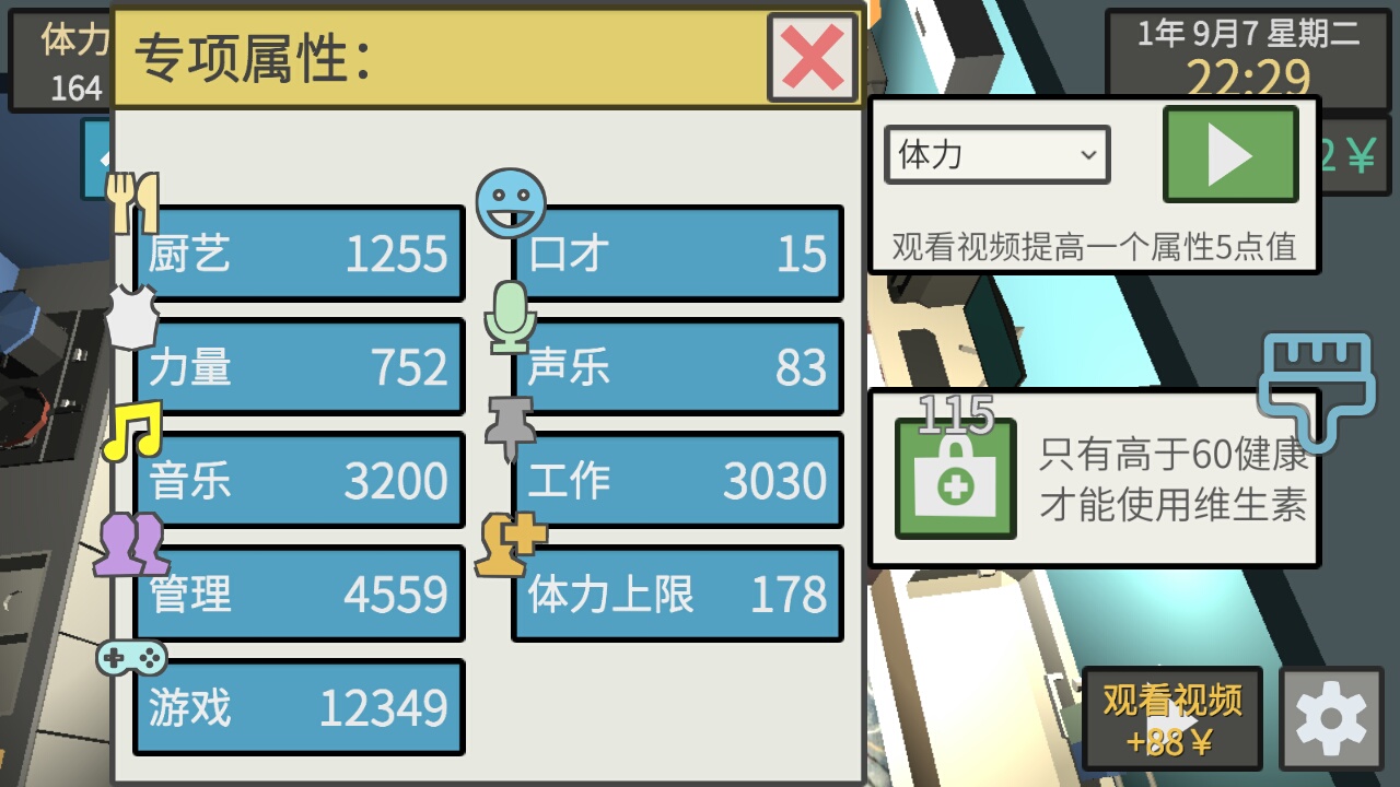 做完一天总监之后,回到家做炸鸡腿,回满体力,洗干净疲劳,拉粑粑,然后打开电脑,刷属性与生活熟练度(顺带白嫖游戏值),刷一次5小时,一次3小时,然后整理状态,等商业楼开门,进去接着打工(呸,当总监)