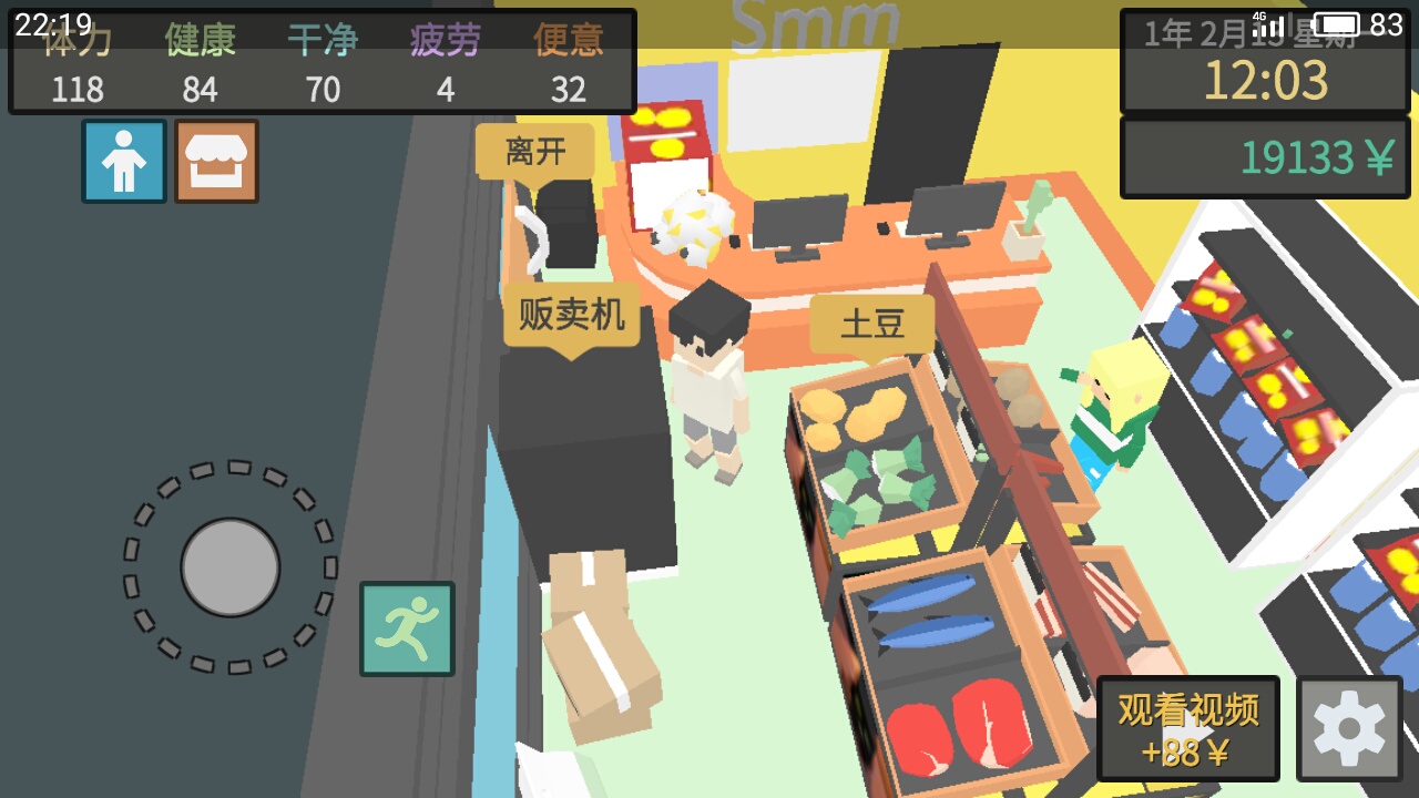 进入超市之后,找到npc小姐姐,跟她对话,选择兼职,时间拉满,干了一次之后没体力了,到旁边的贩卖机买士力架吃(嗝~横扫饥饿,做回自己)