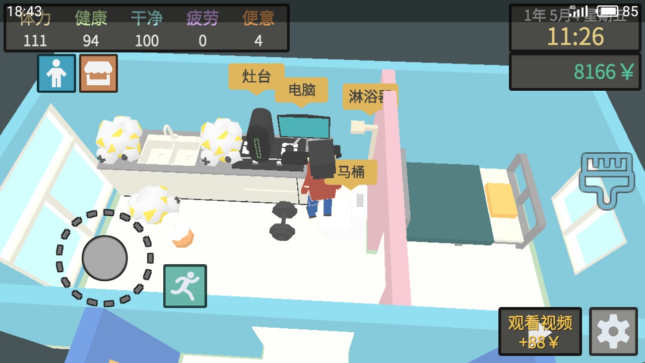 做满五次,紧接着就用喷头洗澡,洗到干净100,便意到80就拉粑粑,整理好体力,接着玩游戏,循环的顺序如下: