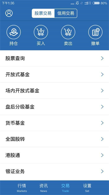 5、在交易页中,可以进行买入、卖出、撤单、查询、持仓等操作。