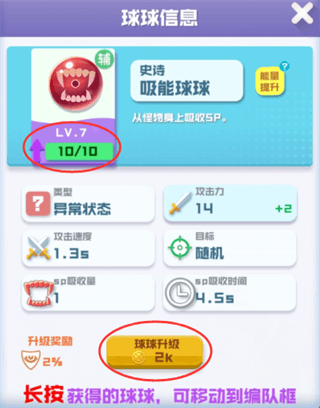 而能源球球每隔一段时间可获得SP,祭品球球合并或受到攻击时可以获得SP,吸能球球可以从怪物身上获得SP,它们都可以为球宝提供更多SP用于召唤、升级,更快提升攻击力;