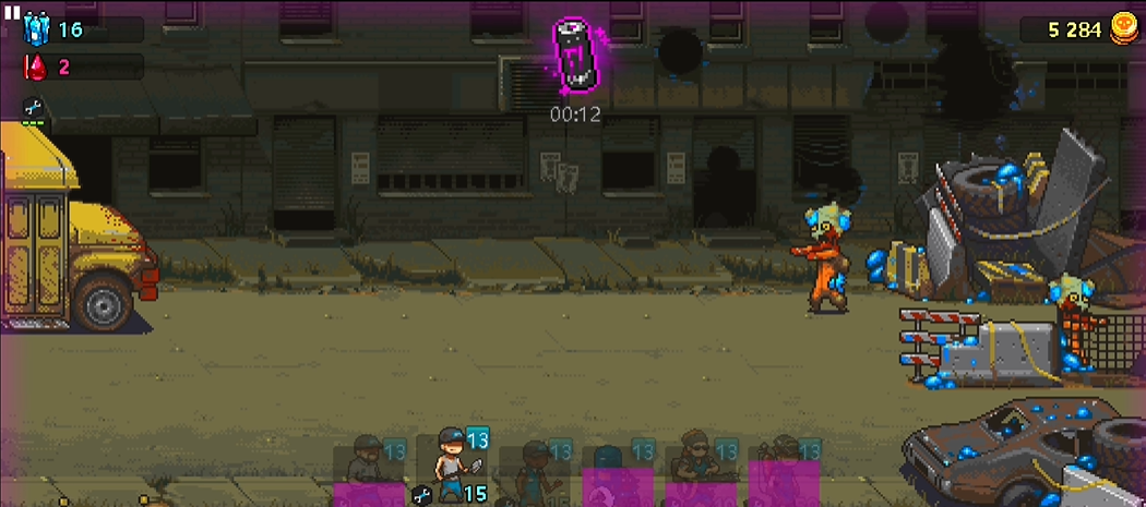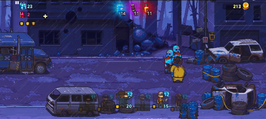 全民僵尸大战2026最新版是一款像素风格的策略游戏,进入游戏后,玩家需要去扮演的是一支部队的头领,保护卡车上的同伴,不择一切手段冲过层层障碍封锁,驾驶卡车带领同伴穿过一片片危险的关卡。如果硬要形容的话这款游戏其实类似于《植物大战僵尸》。但玩家不需要收集太阳光种下植物,而是会缓慢增长并回复体力值,再去召唤士兵或者使用油桶,燃烧瓶和手雷等消灭僵尸群。游戏的操作十分简单,点击角色图标便可以出兵,而像油桶炸弹等道具则需要玩家将坠落地目标拖动放手才可以。