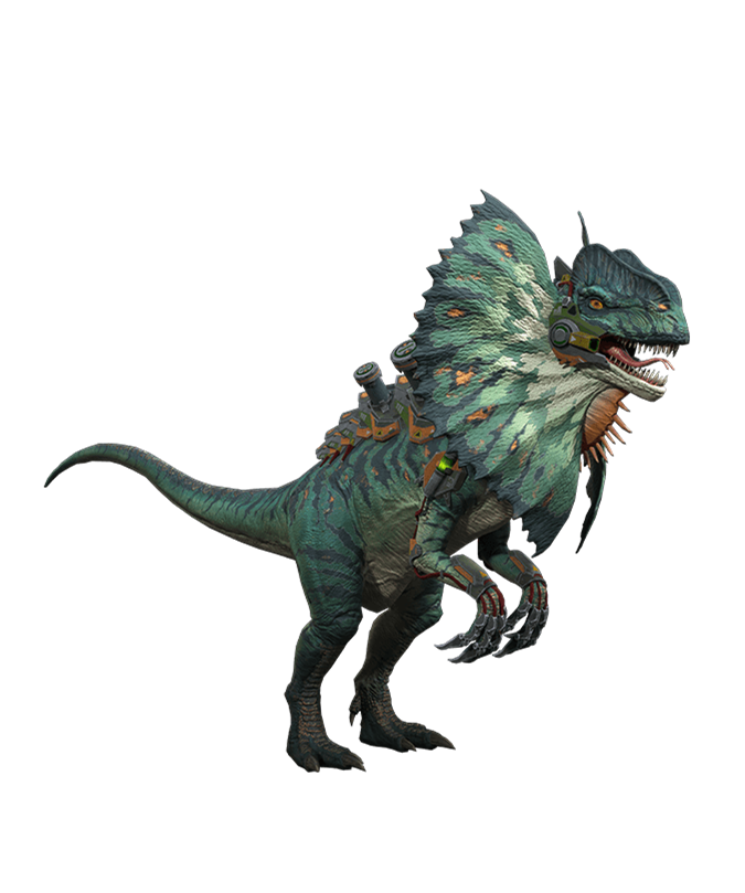 在岛上少有的能与霸王龙体型匹敌,水领主双脊龙的四肢和巨帆让它不管在河流还是陆地都得心应手这种巨大生物在风暴来临之际会变得十分凶残。