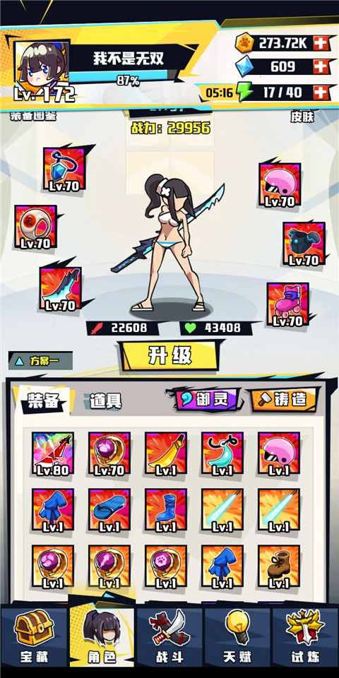 前期爬塔带血刀后期带赤影或者彩黑刀,其他部位以生存为主(不需要升级装备等级),核心技能是行云流水和双盾,爆伤减伤闪避复活。后面补上血量和攻击,狂刀和半月这两个招式也可以吃暴击加成。后面层数高了慢慢补齐轮盘九剑。高层遇见治疗基本打不动,可以直接放弃。黑刀的话爆伤奥义双加成可以打的动治疗,但是没有御灵的减伤加持非常容易吸不到血暴毙。