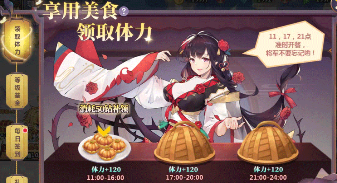 为了让星使大人能够更加精力充沛地完成探险与战斗,灵灵可是在后勤上做出了很大的努力!当然这一切还是要依仗咱们的美厨娘就是了。每天11-16点、17-20点、21-24点这三个时间段内都可以在游戏右上方“福利”处分别领取一次体力,而每次都可以获得120点体力。如果忘记也可以之后使用钻石补领。