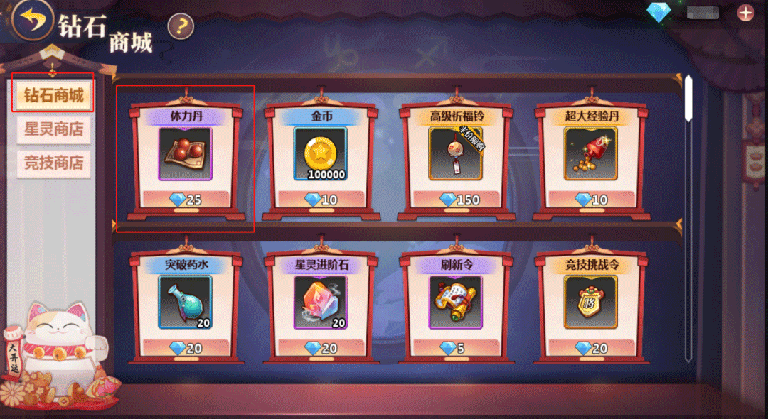 另外,商城中的钻石商店中每天都会有体力丹可以购买,每一颗体力丹能提供星使30点体力的回复。不过由于每天售卖的体力丹比较有限,所以更需要星使大人将体力用到最值得使用的地方。
