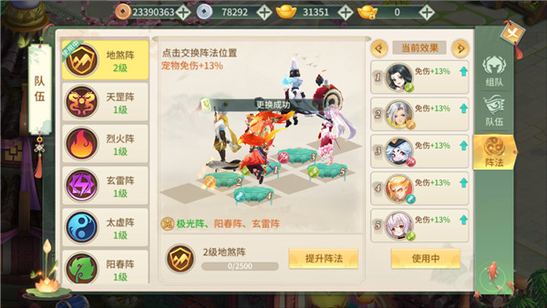 阵法中,不同的站位获得的阵法加成不同,并且不仅仙灵伙伴有加成,宠物也会获得一定的加成效果。仙契师们可以在阵法中查看站位的效果,调整仙灵站位,发挥出他们最大的作用。但是要注意的是,仙契师本人是一定会站在1号位置上,并且不能和仙灵调换位置。