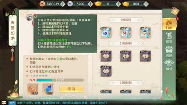 天罡幻术系统需人物等级达到45级解锁,研习幻术需要幻术精华和铜钱,不同等级阶段可以解锁不同的幻术符,等级越高的幻术符属性增加的越好,后面的幻术符还可以增加技能的强化,宠物属性技能强化等。升级幻术可解锁更高级的幻术符图鉴,增加变身时长,变异几率等,当玩家幻术等级达到16级后,幻化可额外获得物攻+1%属性。