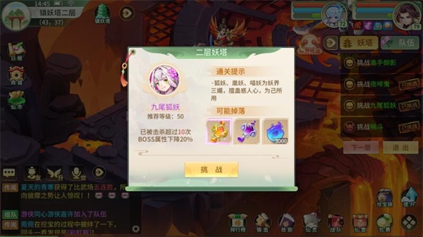 每一个妖魔挑战都有小提示,还会显示可能掉落的护符等级,可以帮助我们更好的挑战成功。镇妖塔三层都挑战成功后,玩家还可以帮助他人挑战来获取助人奖励。