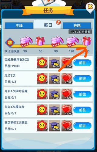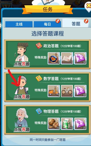 限时答题好多新手不知道怎么做,白白浪费了,限时答题是你每日任务活跃度达到150以后开启(25级主线任务可以不到150就开启限时答题),根据奖励内容选择一个科目,然后让对应科目的老师上课,在规定的时间内完成上课答题数量就行(推荐选奖励摩托车的科目,没有摩托车就选教研币)比如你选的限时答题是英语那你就选英语老师上课,如果这时候已经有别的老师在上课了就退出游戏重新登录,这时候就可以重新选择上课老师了。