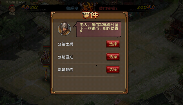 7、还有遇见随机事件,玩家可以自行选择,会导致不同结果,比如分给士兵则可以增长士气,分给百姓则可以增加民心。