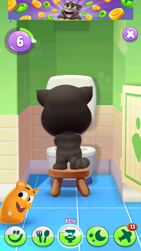 4、上厕所:是的,连汤姆都需要上厕所,这听起来很有趣!帮帮他,确保他舒服。