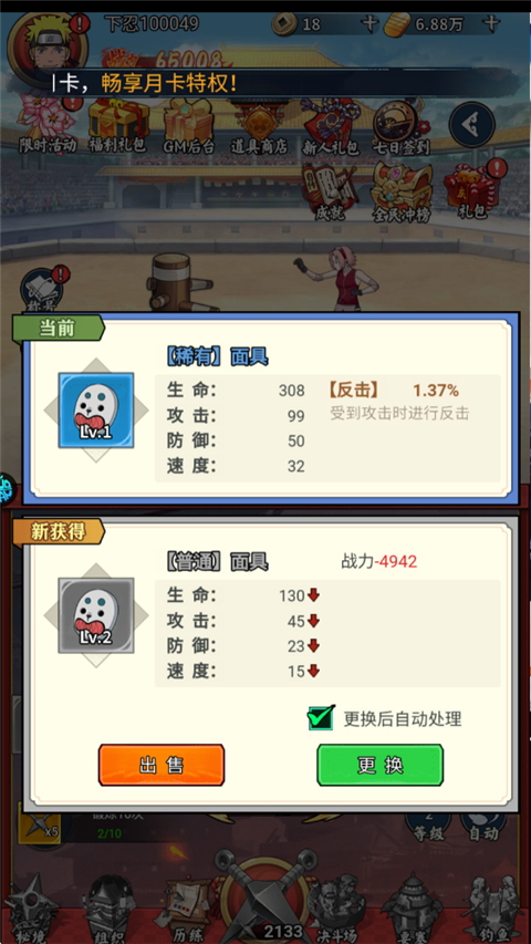 《深渊突击》是一款以火影忍者经典世界观为背景的正版手游,新手福利超级给力!刚创建角色就能拿到64800金币、自选传说忍者和极品橙色异兽,还有GM特权免费激活。游戏主打轻量化开箱玩法,点击飞标就能随机获得装备,品质好坏跟木桩等级有关,升级木桩能提高高品质装备的掉落几率。