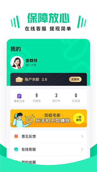 2、放心求职:实名审核、企业审核、人工智能风控、岗位100%人工审核、岗位评价,多重机制保障兼职求职安全。
