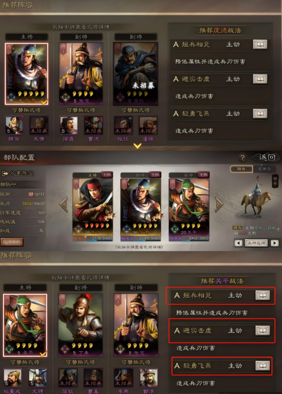 ②我们的第二支队伍没有太多五星武将的时候其实也可以组四星阵容的,首推「良将队伍],在新手期,优先使用良将上阵,在搭配队伍选择兵种时优先选择队伍内所有武将适性较高的兵种。例如关平除了弓兵适性为C,其他兵种适性均为A,可以与大部分良将自由搭配组成较为强力的队伍。