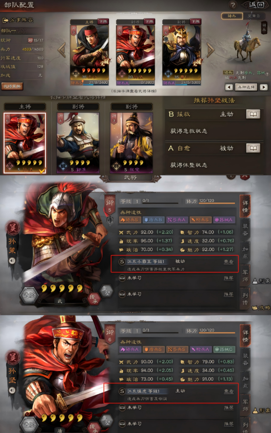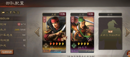 ①优秀的阵容搭配可以使你的开荒进度效率翻倍,我们需要做的就是优先发展部队一,因为部队一是最新成型的三人组。例如我就是抓了五星孙坚,免费抽到了曹仁,刚好就凑成了孙坚+曹仁+五星主公,这个优质的阵容组合,这个时候由于孙坚是S级别的盾兵,还有曹仁也是S级别的盾兵,现在让系统送的五星主公来做主将打输出,因为它的红度比较高,可以多加40点的攻击力。如果你抽到了携带高额物理输出的武将,例如马超、赵云、张飞、吕布这些物理输出比较厉害的五星战将,那你缺的就是控制与辅助位,这时候系统送给你的五星主公武将就是来充当你辅助或者控制的角色。总而言之,五星主公卡是随着你的卡池变化来定位的。