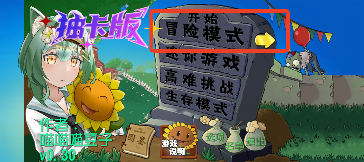 1、新植物需要通过关卡抽卡获得,首先我们点击墓碑第一个【冒险模式】。