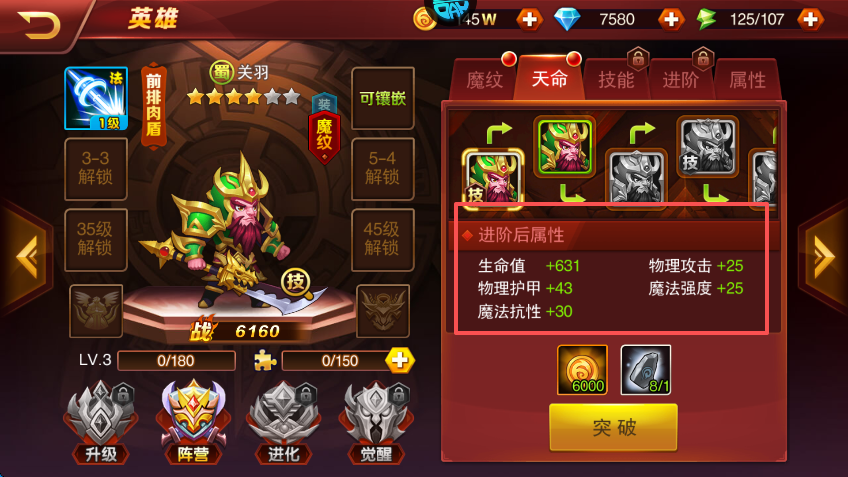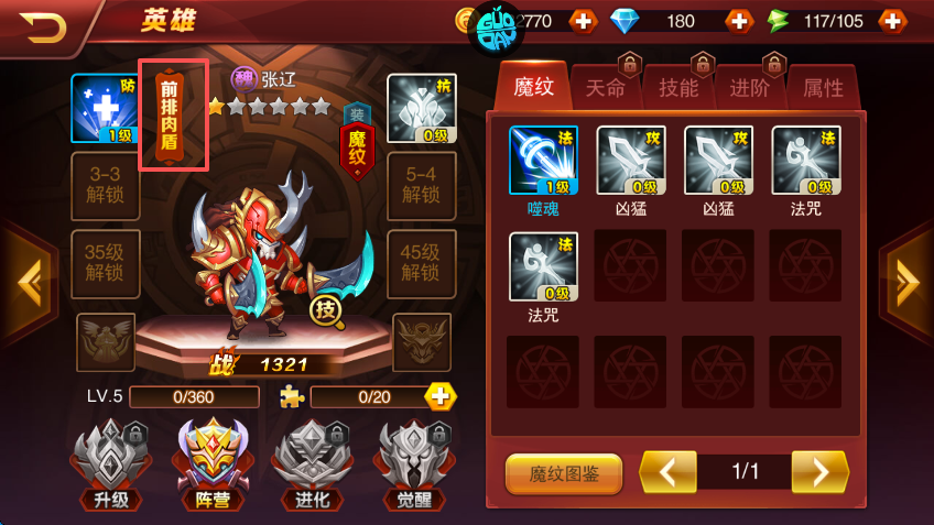 2、需要注意的是,武将的定位和魔纹增加的属性最好相匹配,如前排肉盾应当装备可以增加物防或者法防的魔纹。