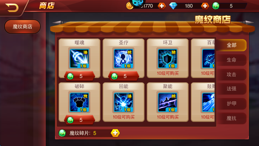 1、玩家可以在魔纹商店购买魔纹,魔纹可以有效提升武将的各方面属性。