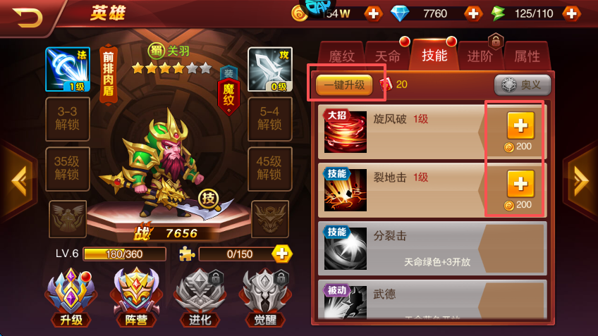 7、武将的技能也是需要升级的,不过资源稀有,这就需要玩家在各个武将与技能之间自行斟酌了。