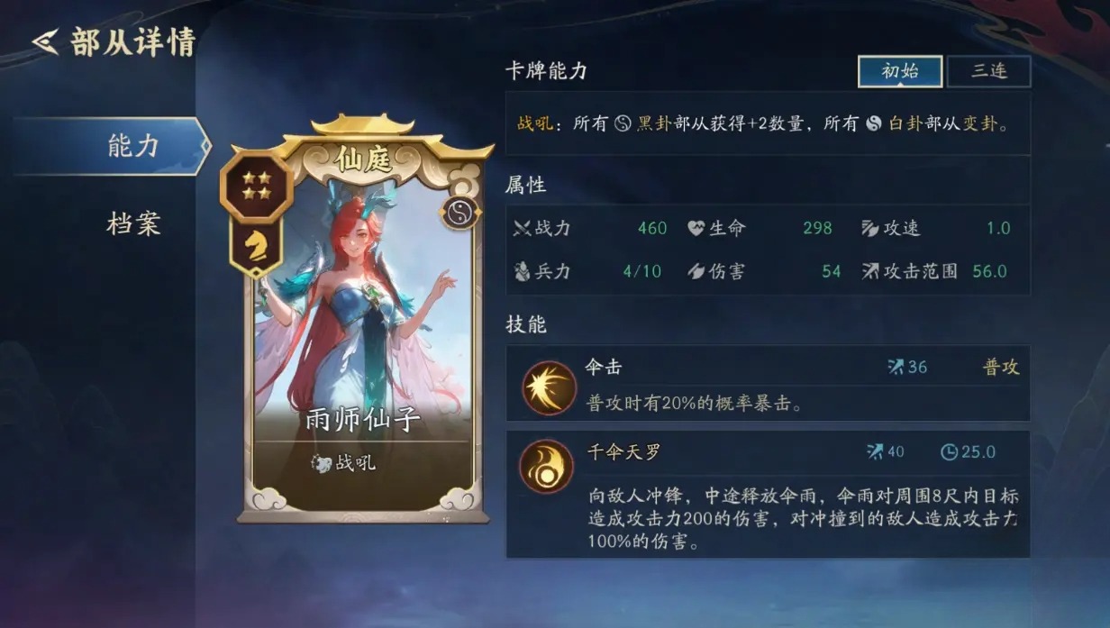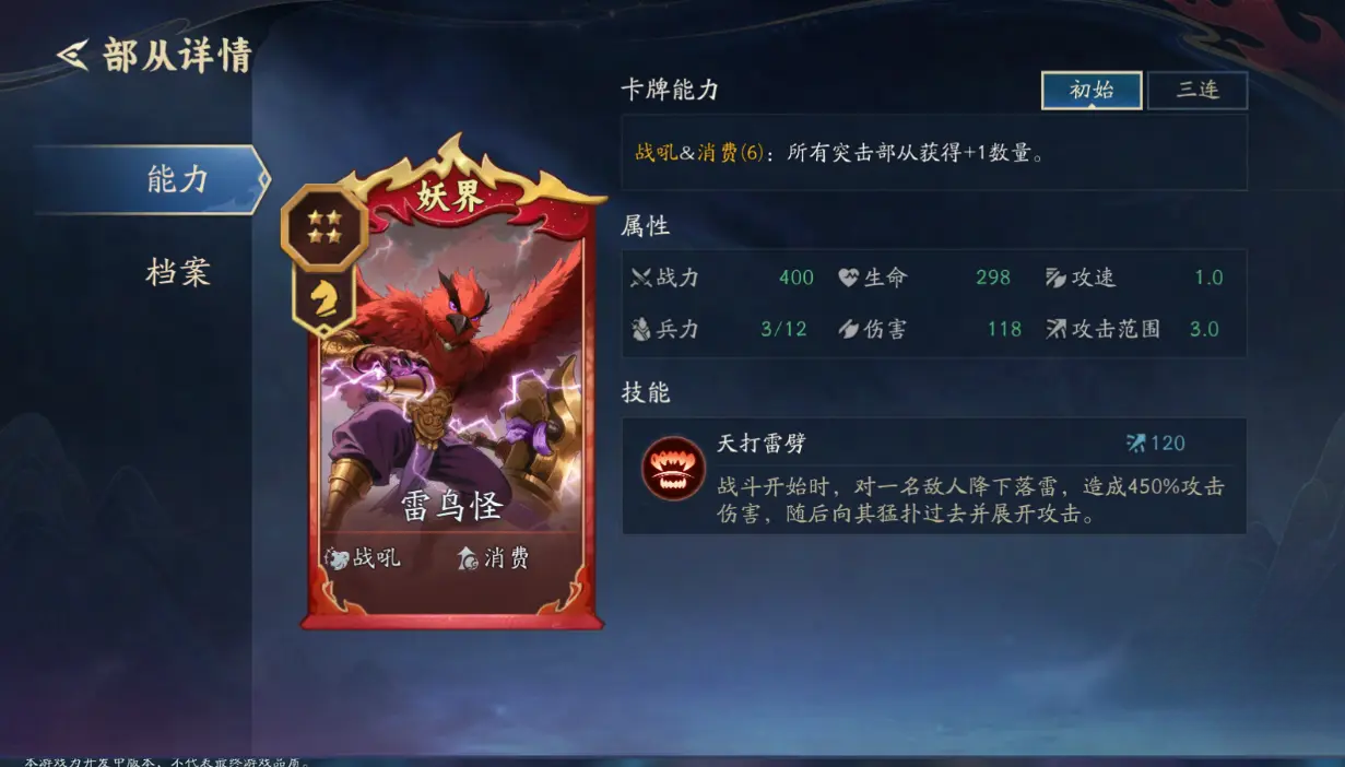 可合成金色单位(战吼/离殇等天赋技能的强化),并获得「发现更高星级部从」的奖励牌。三连奖励给予的部从比当前天书等级高一级。因此可考虑在前期保留三连部从,升级天书后再将其上阵,已获得更高级奖励。