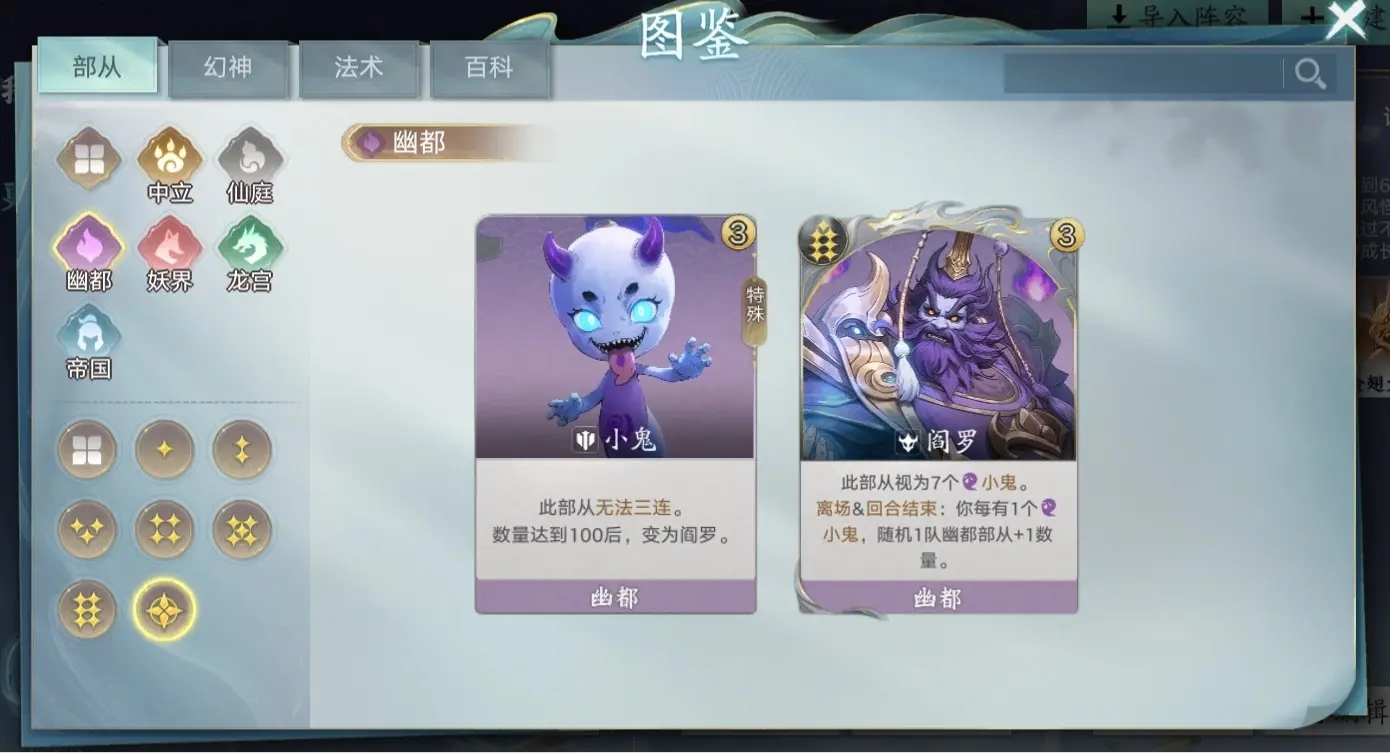 游戏的核心在于势力和资源的搭配。每个势力都有独特的机制和专属资源,比如地府的“瘴气”能增强所有部从的实力,而妖界的“妖气”则让十尾狐妖这样的强力角色更有发挥空间。通过合理利用这些机制,玩家可以创造出各种有趣的阵容组合。