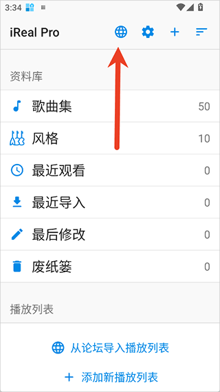 1、在 iReal Pro 主界面,点击左上角或侧边栏的 “地球”图标(即 Forums/论坛)。