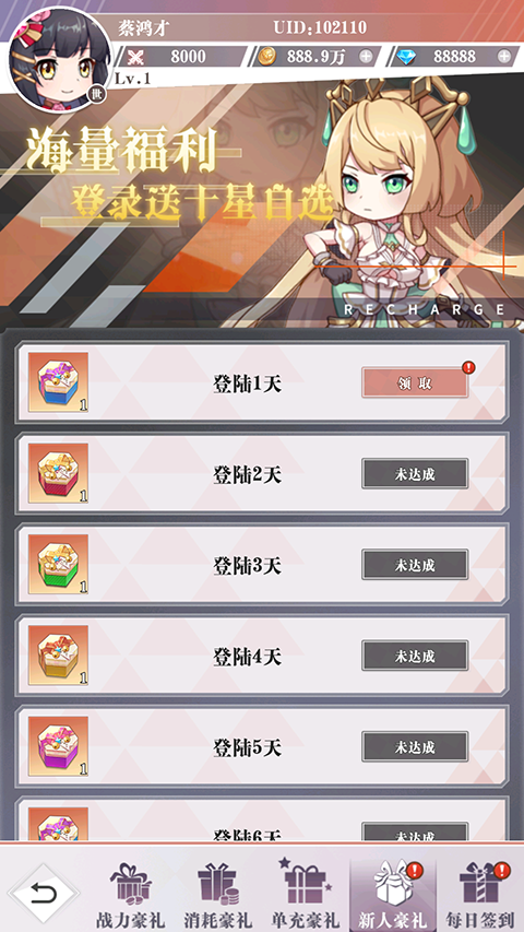 ★创角即送钻石*88888、金币*8888888、英雄经验*8888888、六星卡*8、高级招募卡*8