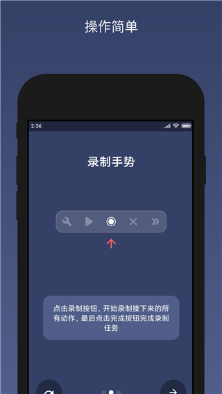 不需要ROOT权限,并可用于全局应用程序,录制手势操作后可直接通过悬浮按钮播放执行