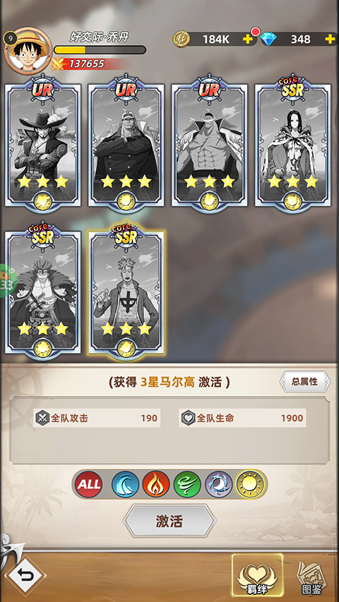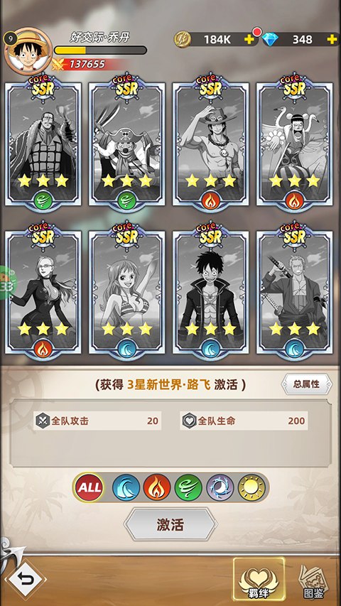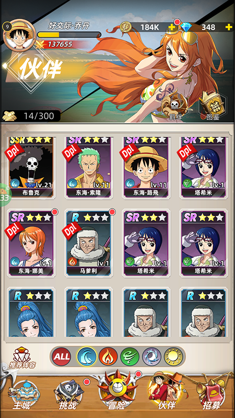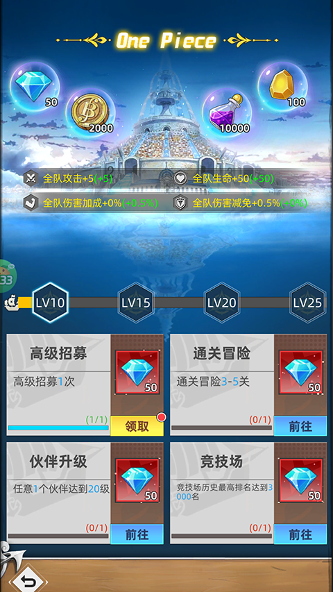 4、主线任务:进入游戏即可体验海贼王经典剧情故事,点击右下角启航即可开始闯关。在闯关前需要招募一些航海伙伴,搭建强力队伍。
