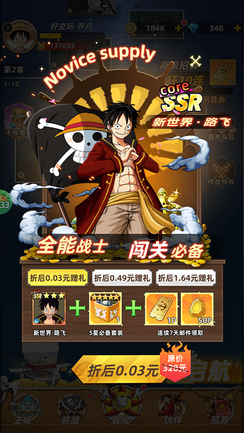 2、首次充值即可获得新世界版本的路飞角色,这是一个强力且具有纪念意义的角色,为玩家的游戏之旅增添一份特别的意义。