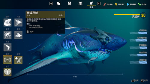 食人鲨的进行形态共分为三种,分别是暗隐、骨质、生物电。三种形态中暗影套综合能力平均;骨质形态为例巨大,莽就完事了;生物电速度快,还能电小动物。玩家们想要进化的话,只要将对应的套装收集到,然后装备就可以完成进化了。