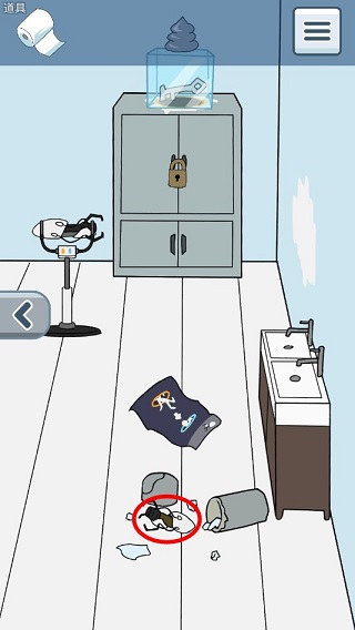 第四关:1、先将场景切换到右边,将垃圾篓放倒在地,拾取下图所示的东西;