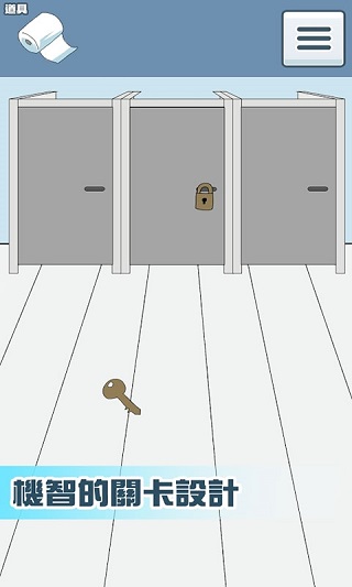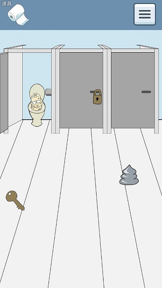 第二关:开始出现了误导道具,这关打开最左边的门,然后打开厕所盖,会出现一个人头,这时点击一下人头给纸,即可过关。