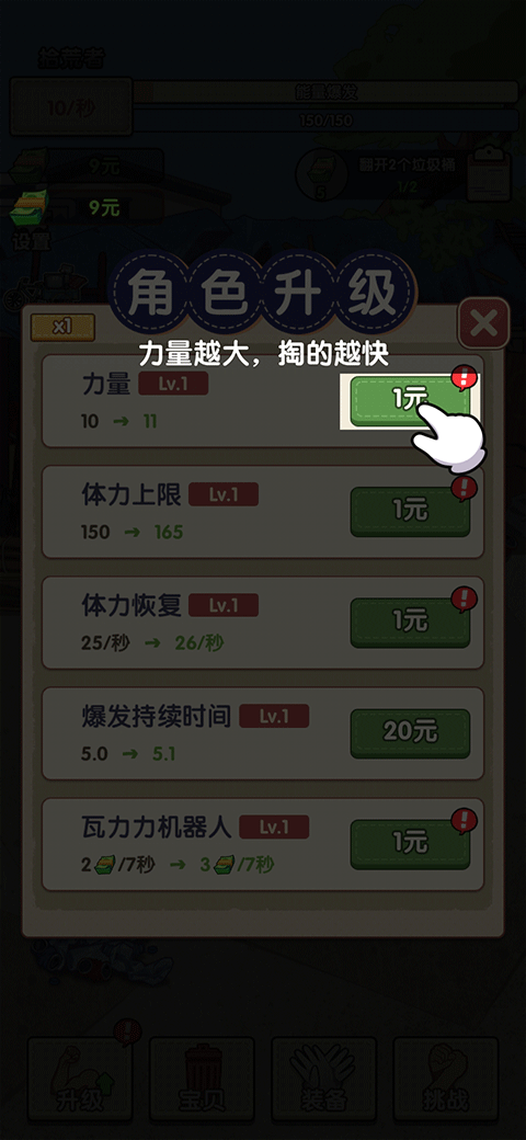 1、金币还可以用于兑换各种装备,利用不同的装备提升拾取废品的能力让你更快地赚取金币。
