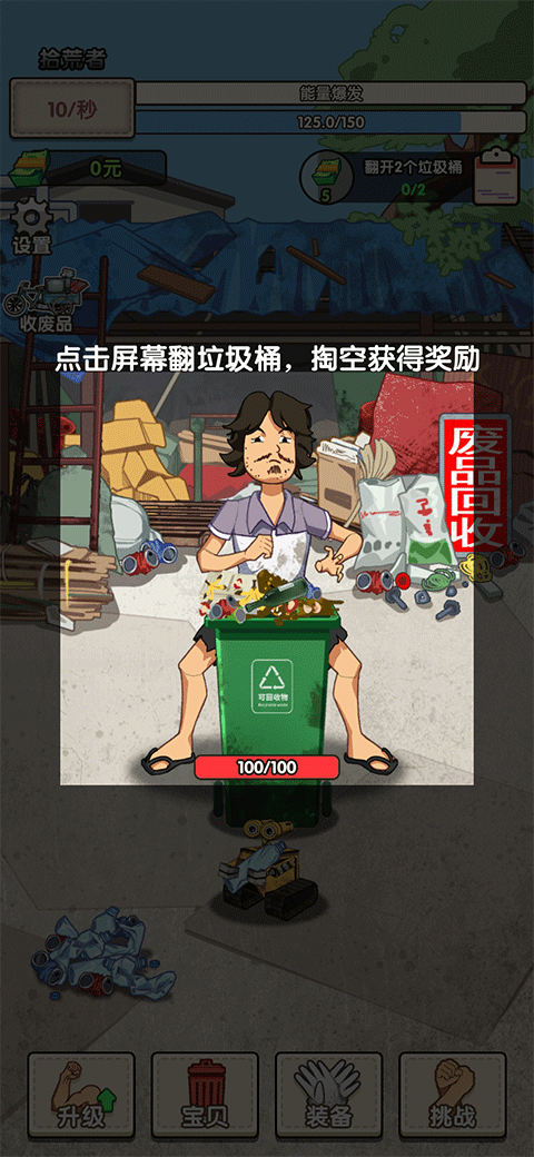 废品大师手机版是一款趣味模拟捡废品游戏。游戏开局你只是一个贫穷的流浪汉,为了能够翻身成为有钱人你需要通过翻找垃圾桶找到值钱的宝贝,并通过回收来赚取金钱,每一次点击都能够增加人物的经验,当经验值到达一定要求后你就可以升级自己的力量、速度、耐力等属性,让自己翻垃圾桶的速度越来越快。当你觉得自己翻垃圾技术超强时,你还可以和其他玩家进行挑战赛,看看谁最强。