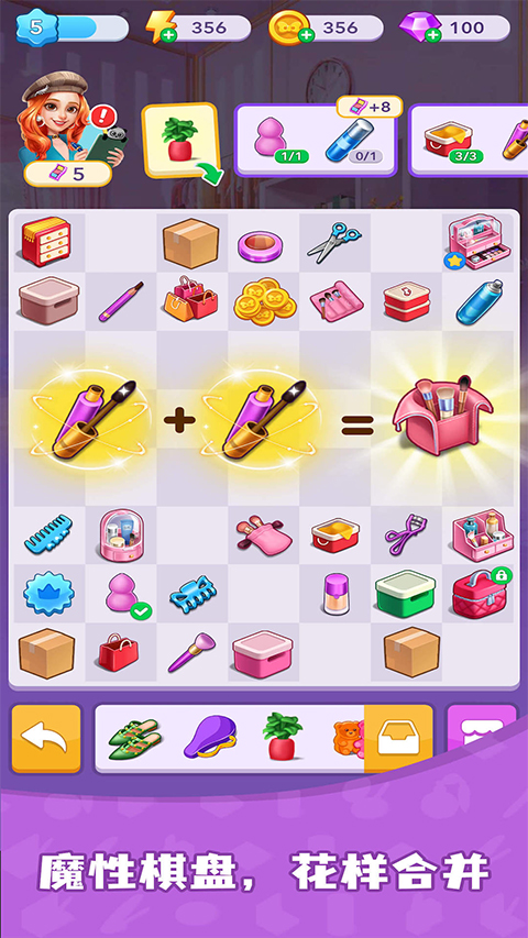 2、轻轻一划,合在一起,他们将会生成更高阶的容器~例如化妆刷将会合成化妆盒,当到达一定的级别;