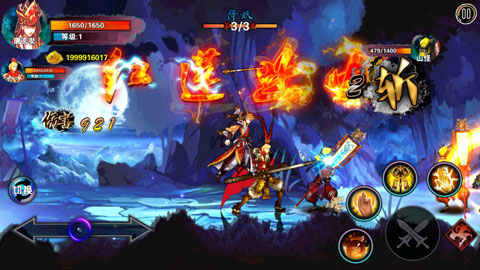 游戏玩法:玩法方面,左侧控制人物移动,上方可以切换角色,右侧主要以攻击为主,四周还加以各种技能,右下角还有一个跳跃按钮。